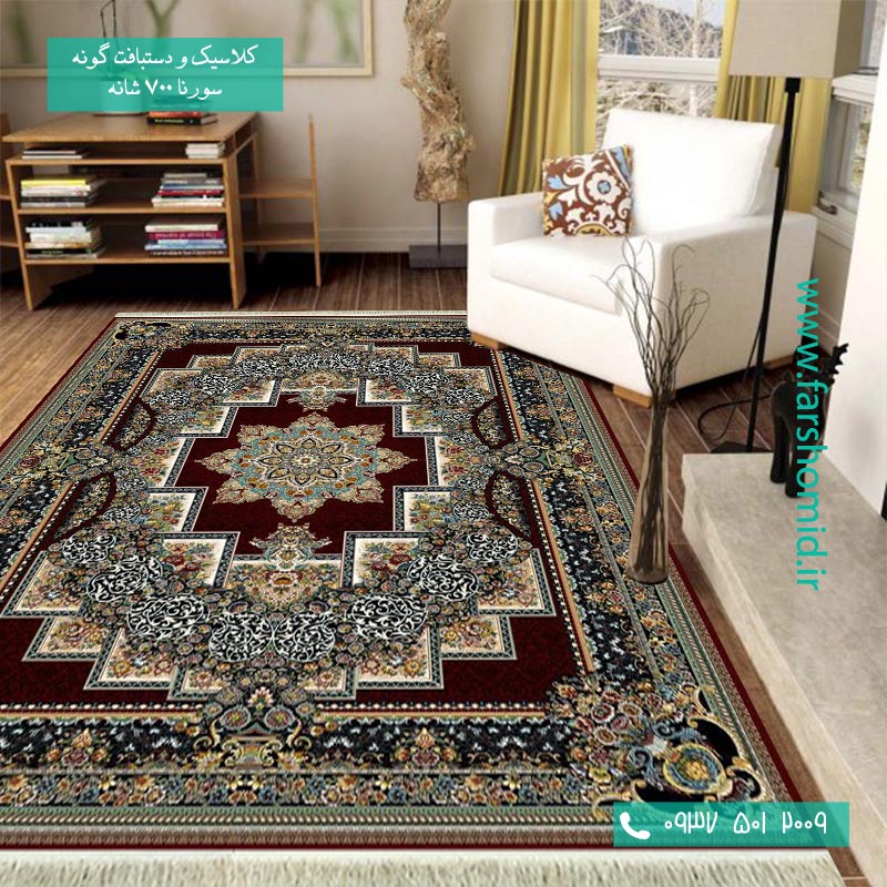 معمولاً فرش هاى دستباف اکثر شهرهاى ایران در سه قالب اصلى به لحاظ طرح بافته مى شوند که عبارت اند از لچک ترنج، خشتى و افشان که در میان آنها لچک ترنج از قدیم مورد استقبال بیشترى قرار گرفته، انتخاب فرش هاى لچک ترنج براى فضاى معمولى و نسبتاً بزرگ بسیار مناسب است و برای پذیرایی و اتاق نشیمن که وسط آن لوستری آویزان باشد معرکه هستند. از طرفی طرح افشان جدیدترین سبک به حساب می آید. طرح افشان به بزرگتر نشان دادن فضا کمک میکند و دکوراتورها همواره فرش هاى با طرح افشان را براى فضا هاى کوچک توصیه مى کنند. اگر به معماری و طراحی های قدیم ایران علاقه مند باشید، طرح خشتی بیشتر همسو با سلیقه شما خواهد بود. ایرانیان باستان پیشتر از طرح های متقارن و چهارگوش، یا لوزی در طراحی بناهای مهم شهر استفاده می کرده اند البته به خواطر داشته باشید طرح های خشتی فضا را کوچکتر نشان میدهند. طراحی این فرش از نوع لچک ترنج می باشد ولی اگر شما این طراحی را دوست ندارید جای نگرانی نیست با توجه به طیف وسیع طراحی موجود، حتما از سایر فرشهای 700 شانه سورنا طرح مورد نظر خود را خواهید یافت.